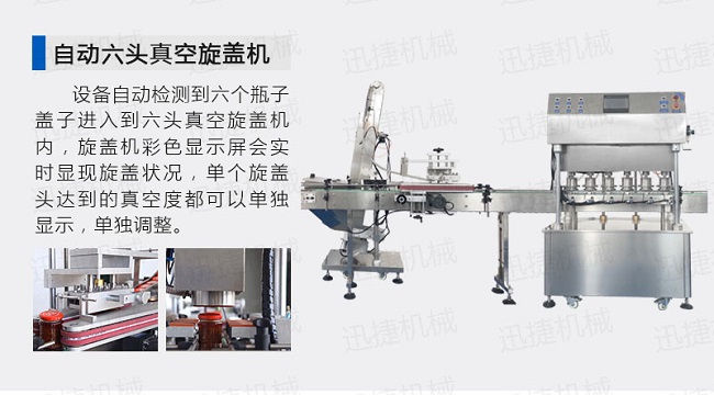該直線式真空旋蓋機是結(jié)合用戶使用的情況,摒棄了傳統(tǒng)轉(zhuǎn)盤式真空旋蓋機的弊端,研制開發(fā)的設(shè)備,設(shè)備自動檢測到六個瓶子蓋子進入到六頭真空旋蓋機內(nèi),旋蓋機彩色顯示屏?xí)崟r顯現(xiàn)旋蓋狀況,整機多點檢測,當(dāng)進口無瓶無蓋、出口堵塞、定位不準(zhǔn)、瓶身傾倒均自動停機。單個旋蓋頭達到的真空度都可以單獨顯示,單獨調(diào)整!