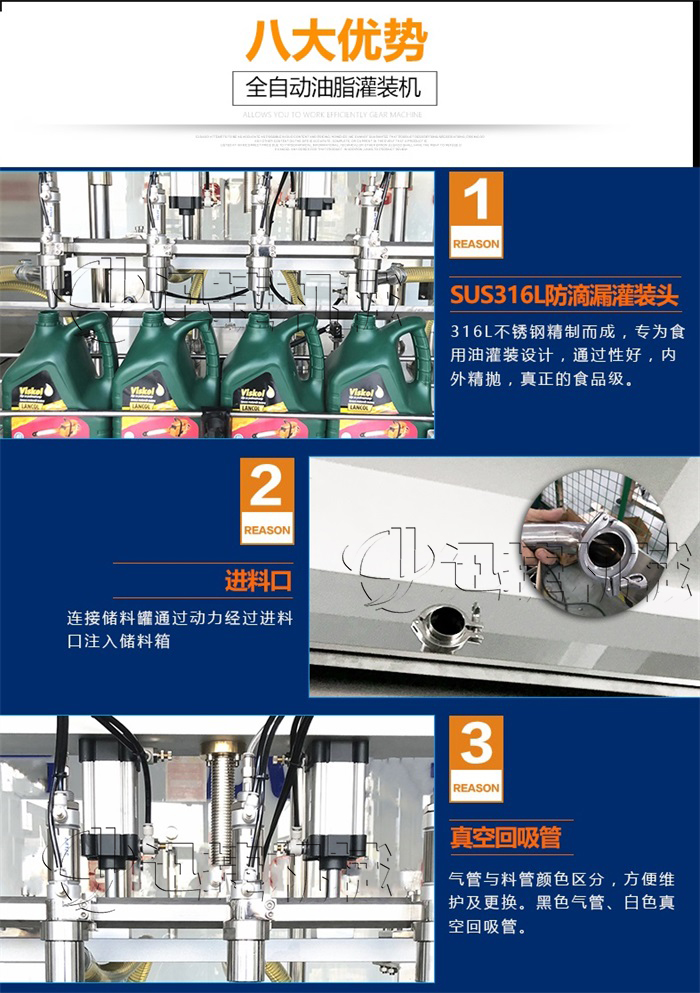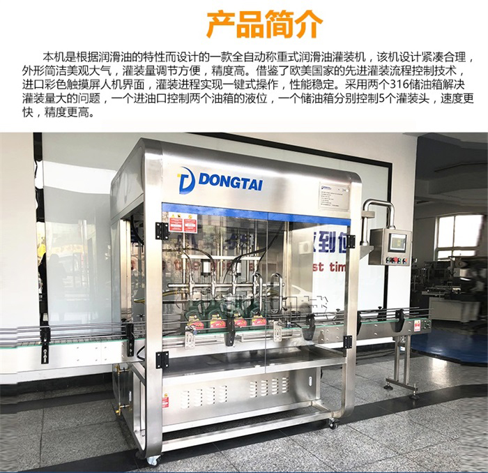 本機(jī)是根據(jù)潤滑油的特性而設(shè)計(jì)的一款全自動稱重式潤滑油灌裝機(jī),該機(jī)設(shè)計(jì)緊湊合理,外形簡介美觀大氣,灌裝量調(diào)節(jié)方便,精度高。借鑒了歐美國家的灌裝流程控制技術(shù),彩色觸摸屏人機(jī)界面,灌裝進(jìn)程實(shí)現(xiàn)一鍵操作,性能穩(wěn)定。采用兩個(gè)316儲油罐解決灌裝量大的問題,一個(gè)進(jìn)油口控制兩個(gè)油箱的液位,一個(gè)儲油箱分別控制5個(gè)灌裝頭,速度更快,精度更高。